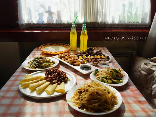 餐厅主打春饼,而春饼这俩字儿自带生活气息,那是极少在外吃到的东西,也是我第一次在家以外吃春饼。春饼的饼跟烤鸭的饼不同,会略厚实,卷起乱糟糟的合菜和酱肉,吃下去是规规整整的春天开始了。满满一大桌子,我和闺蜜两个人连一半儿都没吃完。